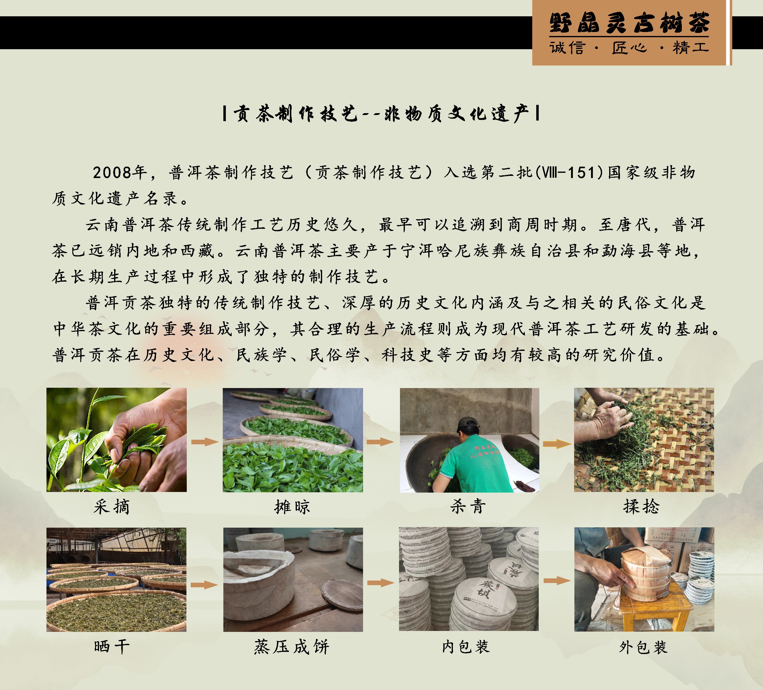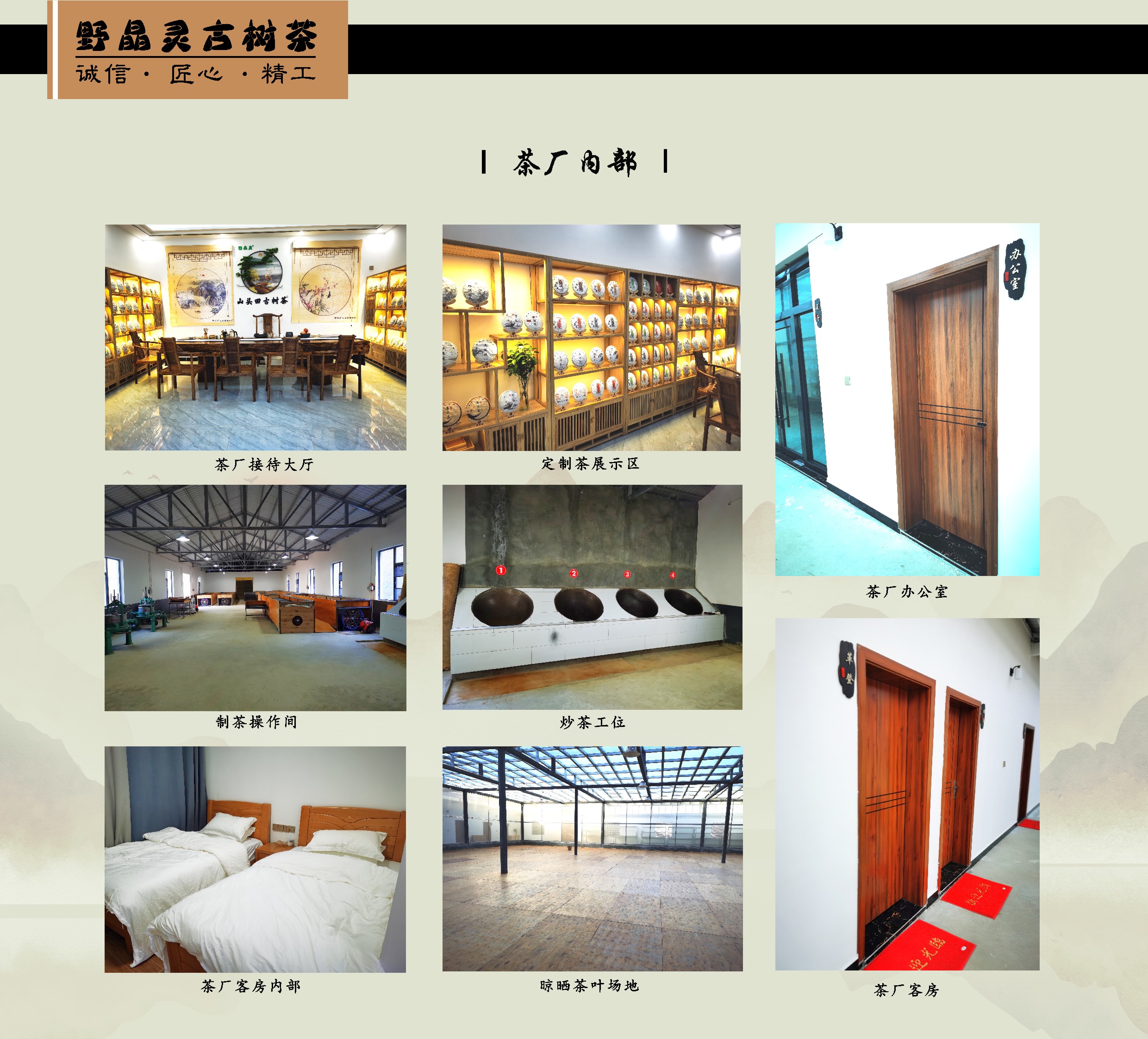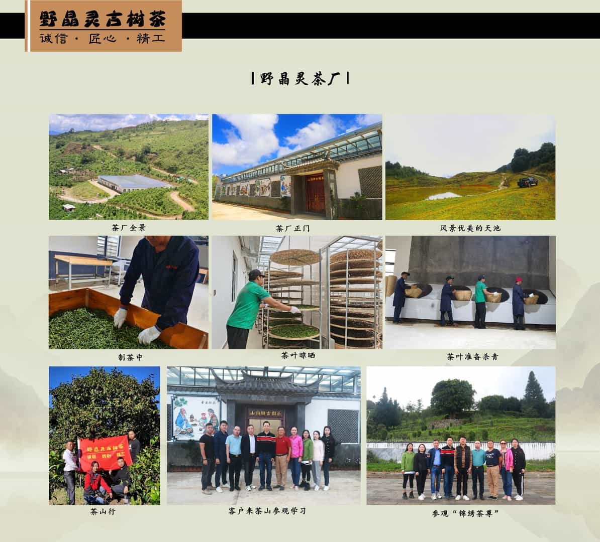 野晶灵古树茶厂以“诚信、匠心、精工”的建厂理念,以:“一片茶叶带富一方百姓”的建厂使命,,以实现“架起茶农到茶客的桥梁”的品牌愿景,在普洱茶传统制作工艺基础上,结合现代化生产工艺,在提高生产效率的同时,提高了产品的品质和稳定性。